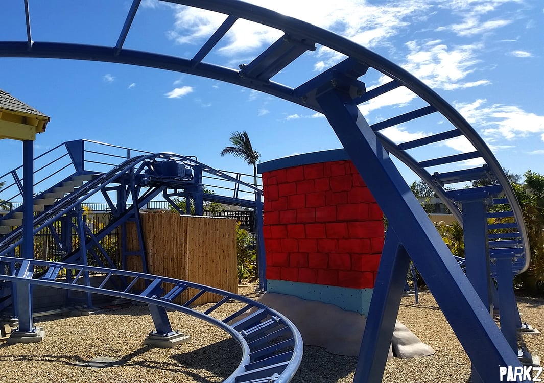 Inoffensive SpongeBob-esque landscaping surrounds the coaster, though the ride is anything but immersive.