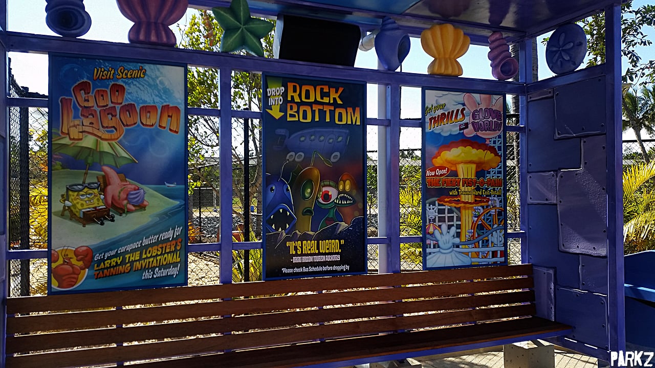 Posters adorn a bus shelter for such exciting Bikini Bottom destinations as Glove World.