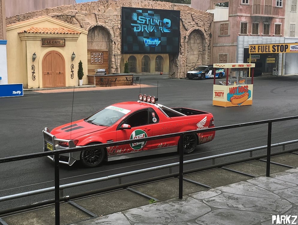 I would have expected that this hotdog stand placed right in the middle of the arena might serve a purpose in the show – it doesn't. Aside from a pre-recorded slo-mo squirt of tomato sauce, this stand – like the rest of Hollywood Stunt Driver 2 – seems to exist "just because".