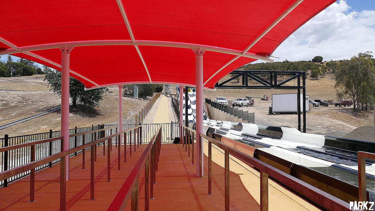 A red shade canopy covers the switchback queue area.