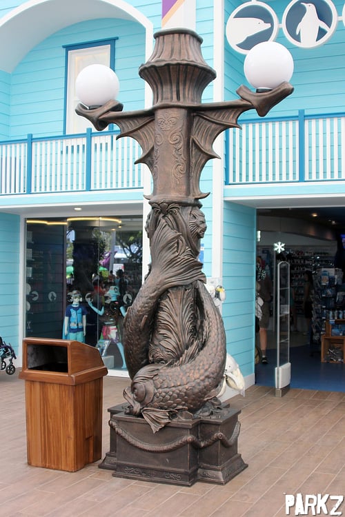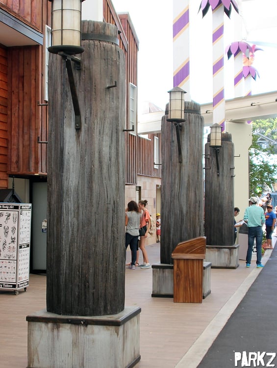 The plaza roof's support columns feature new themed lights that helps make the area feel a little utilitarian. Some are in this wood-style wharf look.