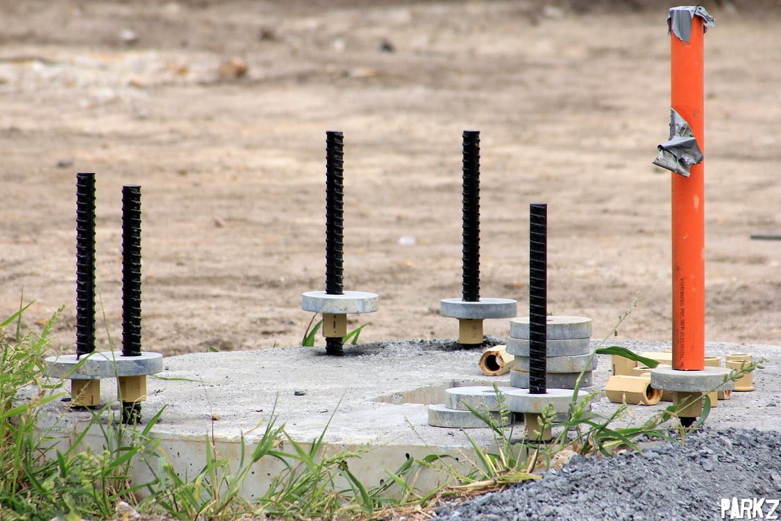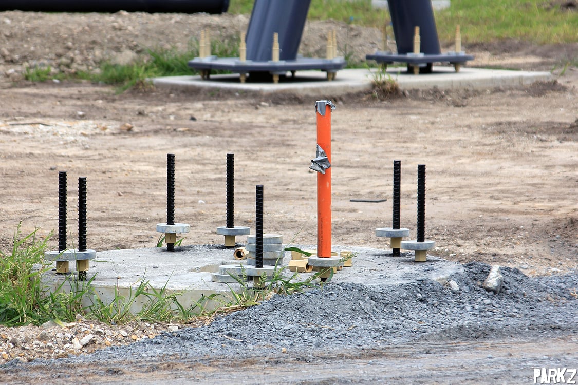 Foundation bolts painted black in preparation for supports. Not all footings get this treatment as you can see in the background.