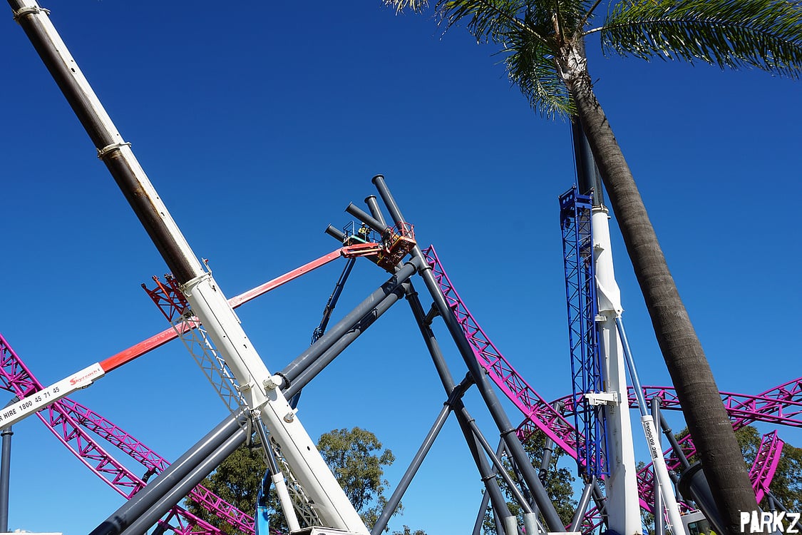 Blue skies are the backdrop for construction as Australia's largest roller coaster ever goes up at Warner Bros. Movie World.