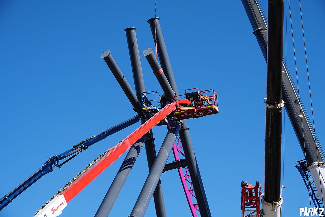 Work has started on the lone support in the car park. It will join to the support structure of the lift hill and first drop.