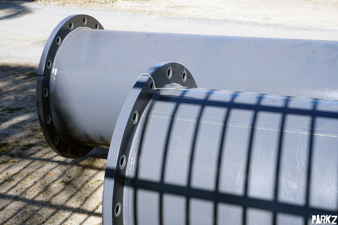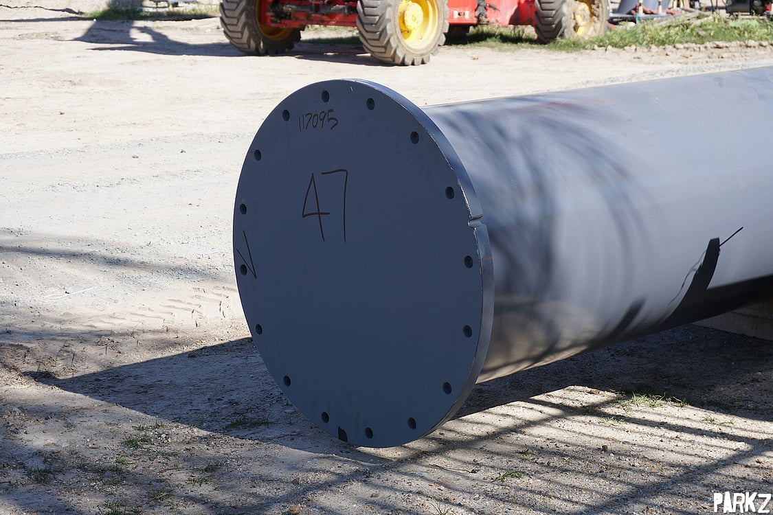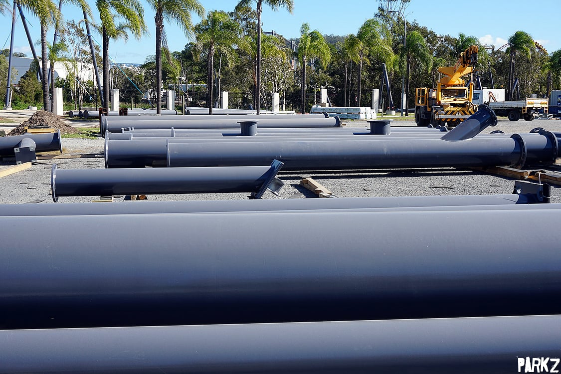Many support columns have arrived but overall the staging area in car park is still quite sparse as construction crews wait for more track shipments from Germany.