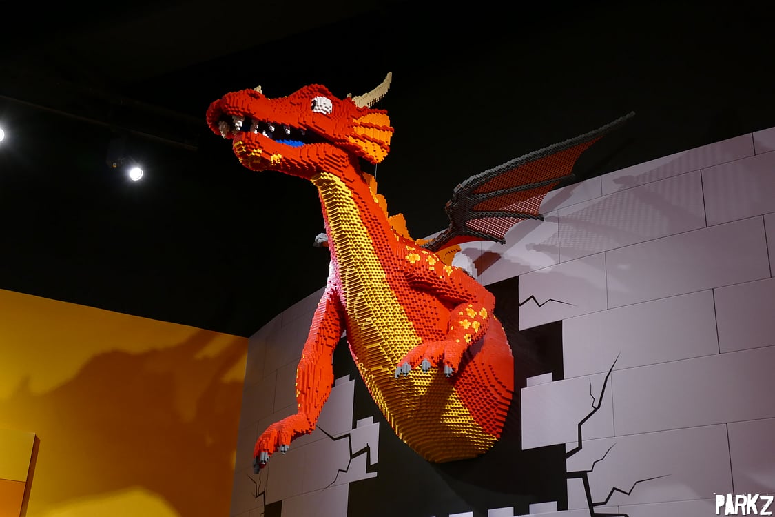 A large dragon made entirely made out of Lego bricks breaks through a wall near the Merlin's Apprentice ride.