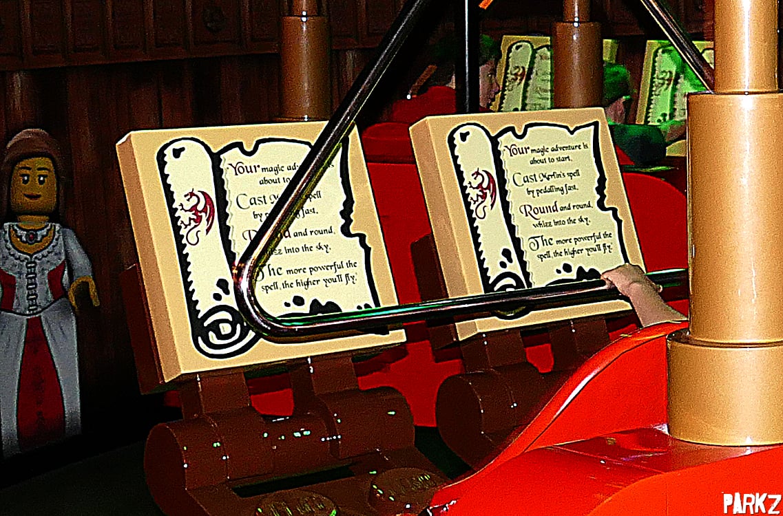 Each rider is presented with a spell book from Merlin. "Your magic ddventure is about to start" "Cast Merlin's spell by pedalling hard" "Round and round, whizz into the sky" "The more powerful the spell the higher you'll fly".