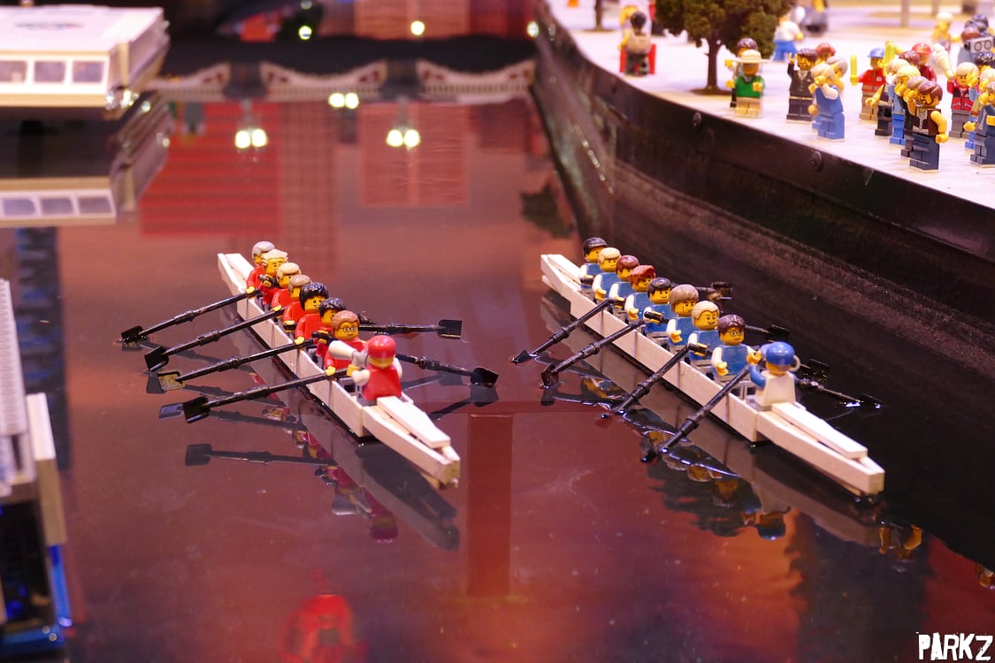 Minifigures row down the Yarra river.