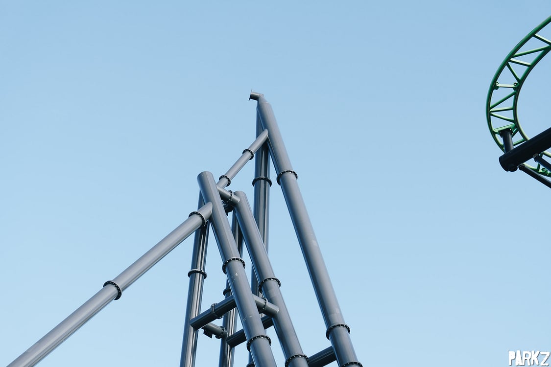 It's a bizarre collection of steel columns and beams that supports the first drop. The idea seems to start with the simple, elegant a-frame supports of B&M coasters, but quickly becomes its own convoluted mess of poles and angles. It was likely building so close to the main entrance road that necessitated this odd design choice.
