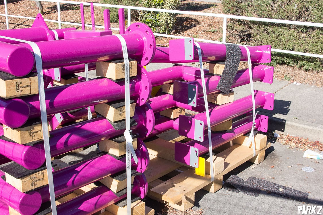 These three plates will bolt into the angled concrete foundation that was seen earlier in construction. This particular point will support much of the weight of the lift hill.