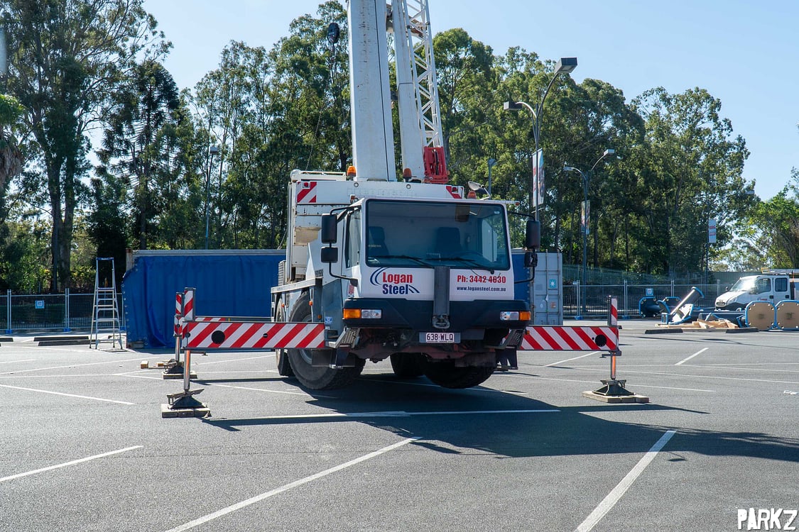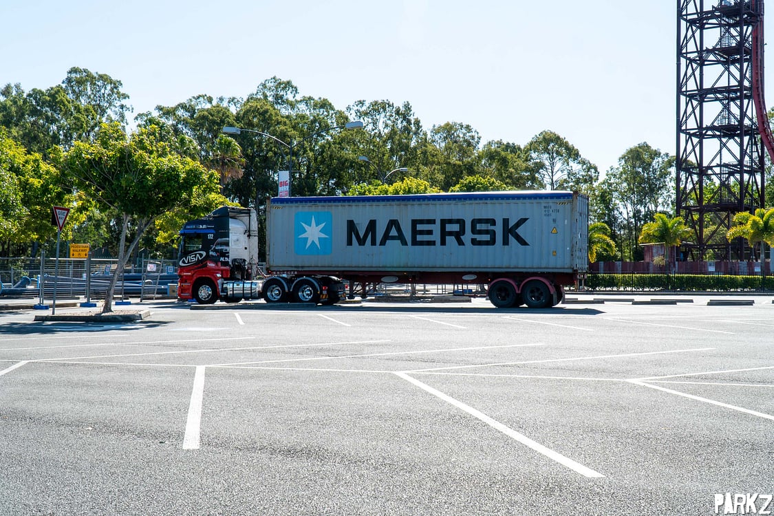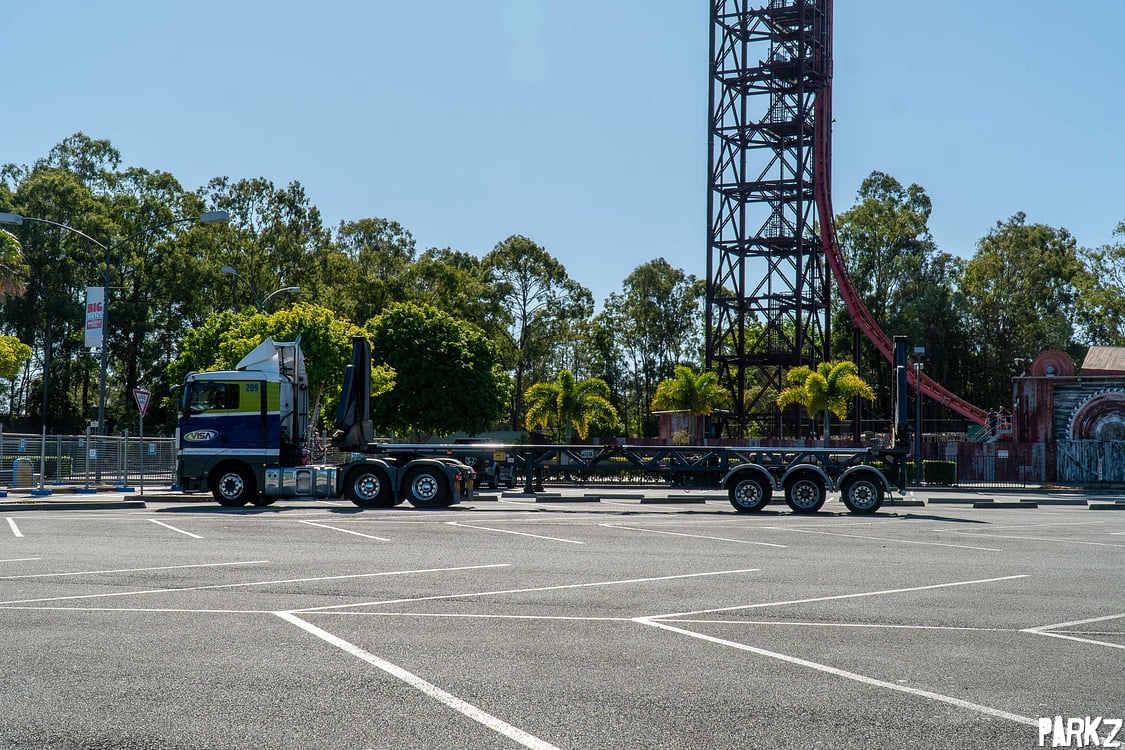 More and more roller coaster parts from Mack Rides fill the car park at Dreamworld.